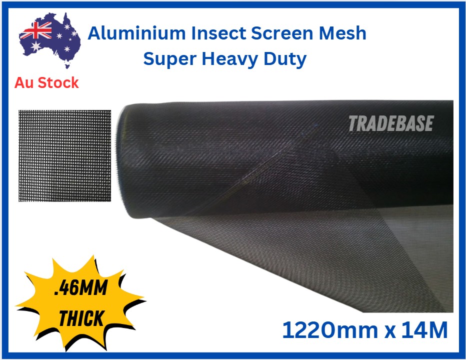 Specifications:• Material: Aluminium• Weave: 14 x 14 strands per inch• Wire Diameter: 0.46mm• Coating: Black epoxy finish• Roll Length: 14 metres• Available Widths: 900mm, 1220mmStrong. Lightweight. Built for Lasting Protection. TradeBase Super Heavy Duty aluminium insect mesh delivers a long-lasting, rust-resistant solution for screening windows and doors. Engineered for strength, visibility, and durability, this mesh provides reliable insect protection while maintaining airflow and outward views. The fine, uniform weave makes it easy to install with a crisp, clean finish.