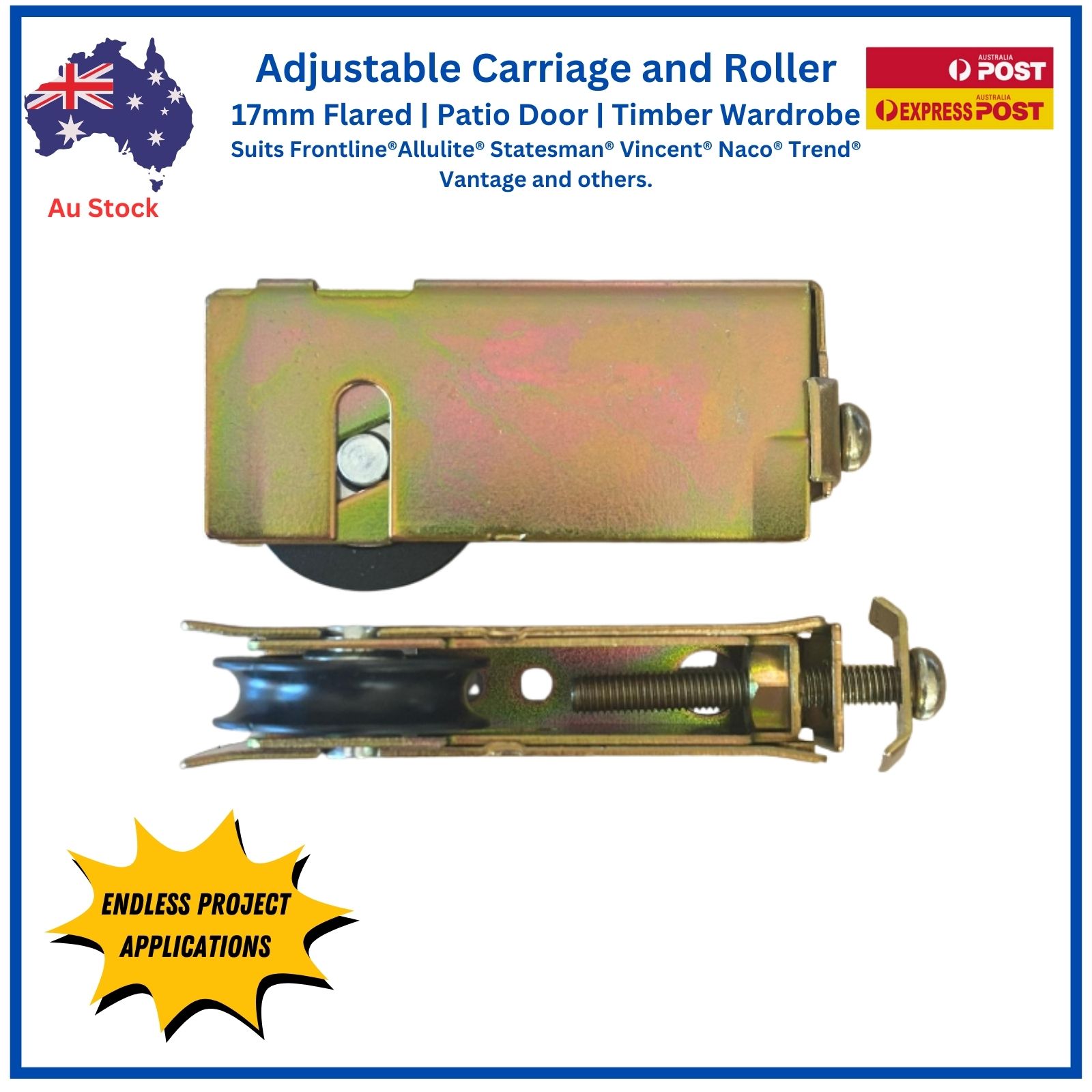 This adjustable patio door carriage and roller is designed for smooth, reliable operation in patio and timber wardrobe sliding doors.