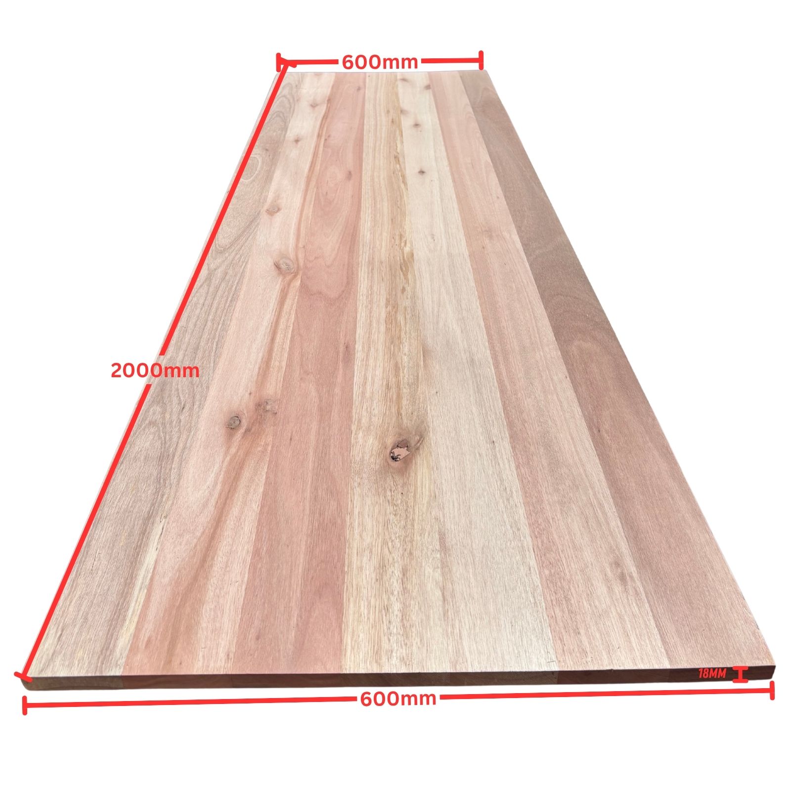 Kiln-dried Sydney Rose Gum (Eucalyptus grandis) solid lamella panel, 18 x 600 x 2000mm. Feature-grade hardwood — warm rose-pink tones, natural colour variation, gum vein and character knots present. Sourced from responsible renewable plantation timber. Ready to paint