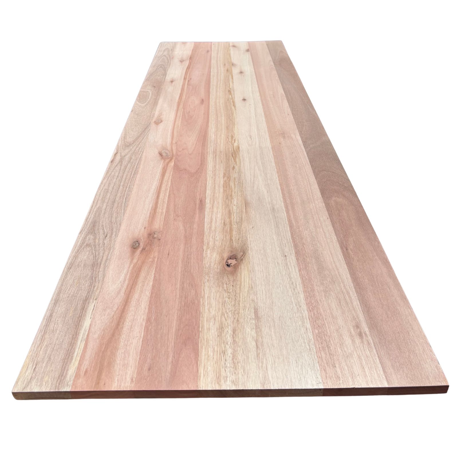 Sydney Rose Gum is prized for its warm rose-pink to salmon-buff tones, natural grain movement, and genuine hardwood character. This is a feature-grade panel — expect natural colour variation between lamellas, gum vein, and occasional knots. No two panels look the same, and that’s the point.