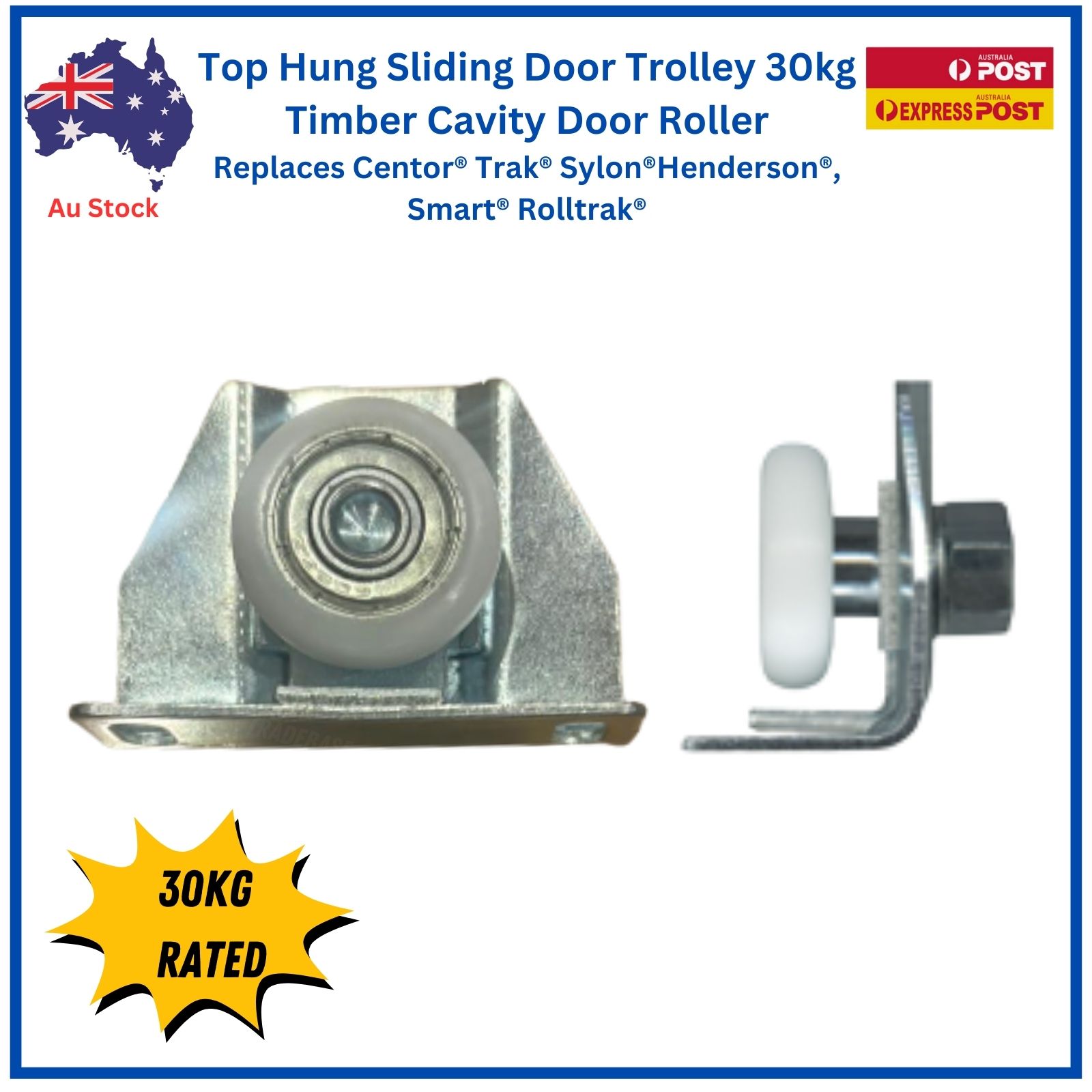 Top Hung Sliding Door Trolley with adjustable steel carriage and convex acetal bearing roller. Australian made, includes anti-bounce guide. Designed for top hung timber cavity and hanging sliding doors. Rated to 30 kg.